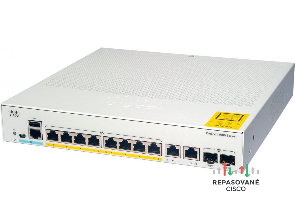 Cisco Catalyst C1000-8FP-2G-L. Typ prepínača: Riadený, Prepínač vrstiev: L2. Typy RJ-45 Ethernet portov: Gigabit Ethernet (10/100/1000), Počet RJ-45 Ethernet portov: 8, Počet USB 2.0 portov: 1, Konzolový port: RJ-45/Mini-USB. Plne duplexný režim. Tabuľka MAC adries: 16000 položky, Limit prepínania: 20 Gbit/s. Sieťový štandard: IEEE 802.1AX, IEEE 802.1D, IEEE 802.1Q, IEEE 802.1ab, IEEE 802.1p, IEEE 802.1s, IEEE 802.1w, IEEE.... Podpora napájania cez Ethernet (PoE)